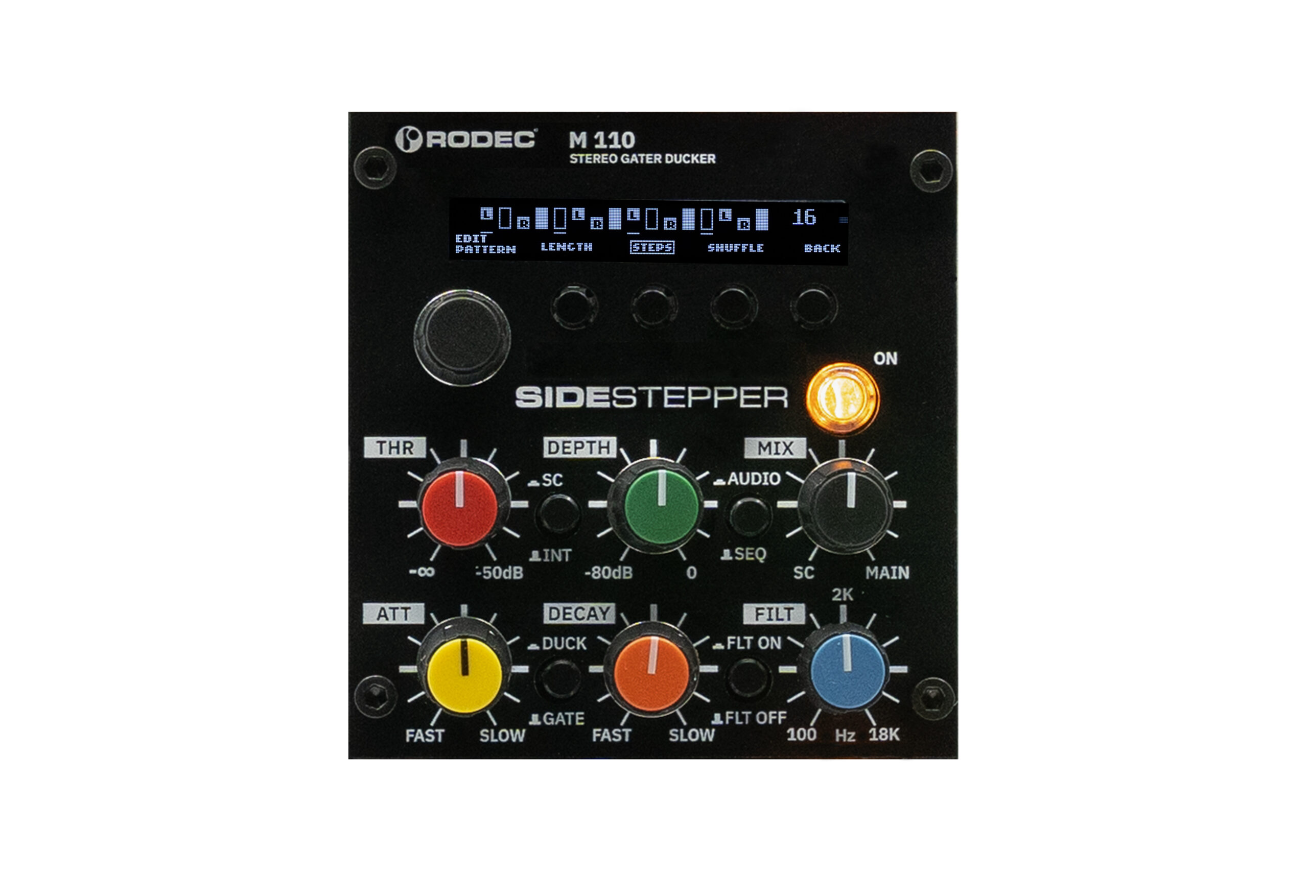 Die integrierte digitale Step-Sequencer-Sektion ermöglicht eine präzise Kontrolle über das Stereobild. Im Gegensatz zu klassischen Duckern lassen sich hier eigene rhythmische Muster programmieren, die die vollständig analogen Ducking- und Gating-Schaltungen steuern. Pattern-Längen von 1 bis 16 Steps erlauben komplexe polyrhythmische Strukturen in Kombination mit gängigen Taktarten. Funktionen wie individuelle Step-Längen, Shuffle und ein integrierter Zufallsgenerator eröffnen nahezu unbegrenzte rhythmische Möglichkeiten.