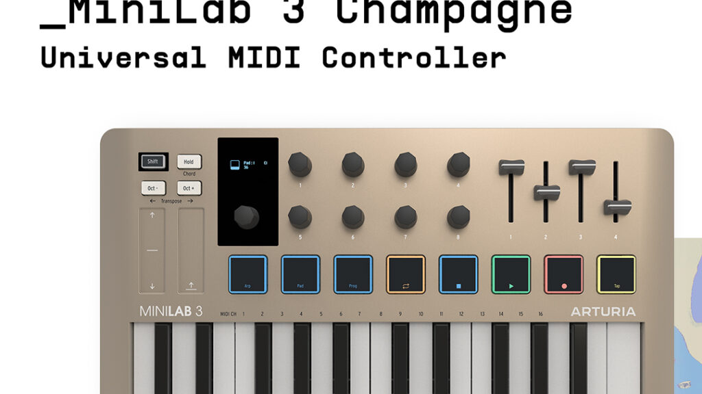 MiniLab 3 Champagne Ein kompakter, stilvoller MIDI-Controller im eleganten Champagner-Finish. Er bietet intuitive Bedienung mit Pads, Reglern und Display, über 500 Sounds aus…