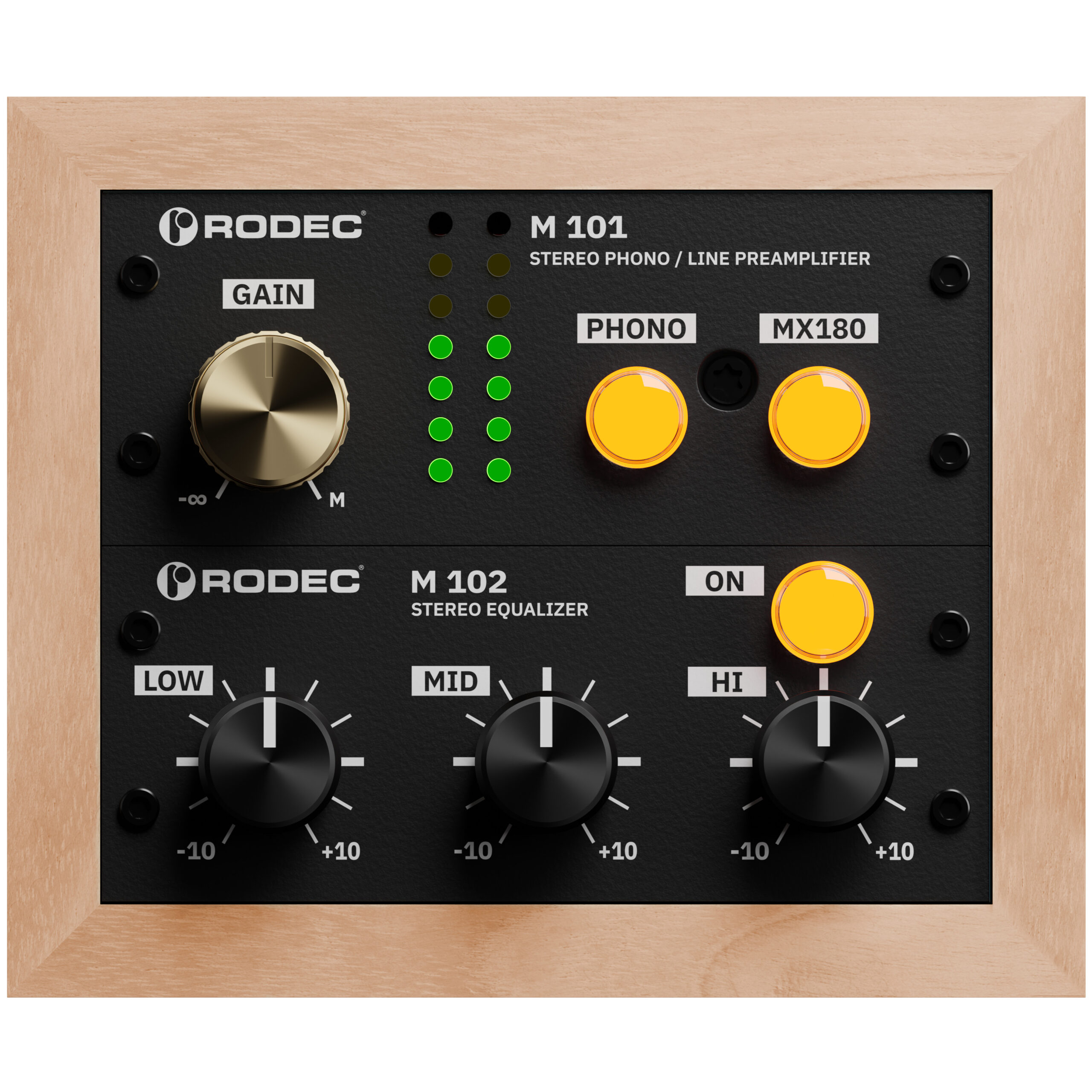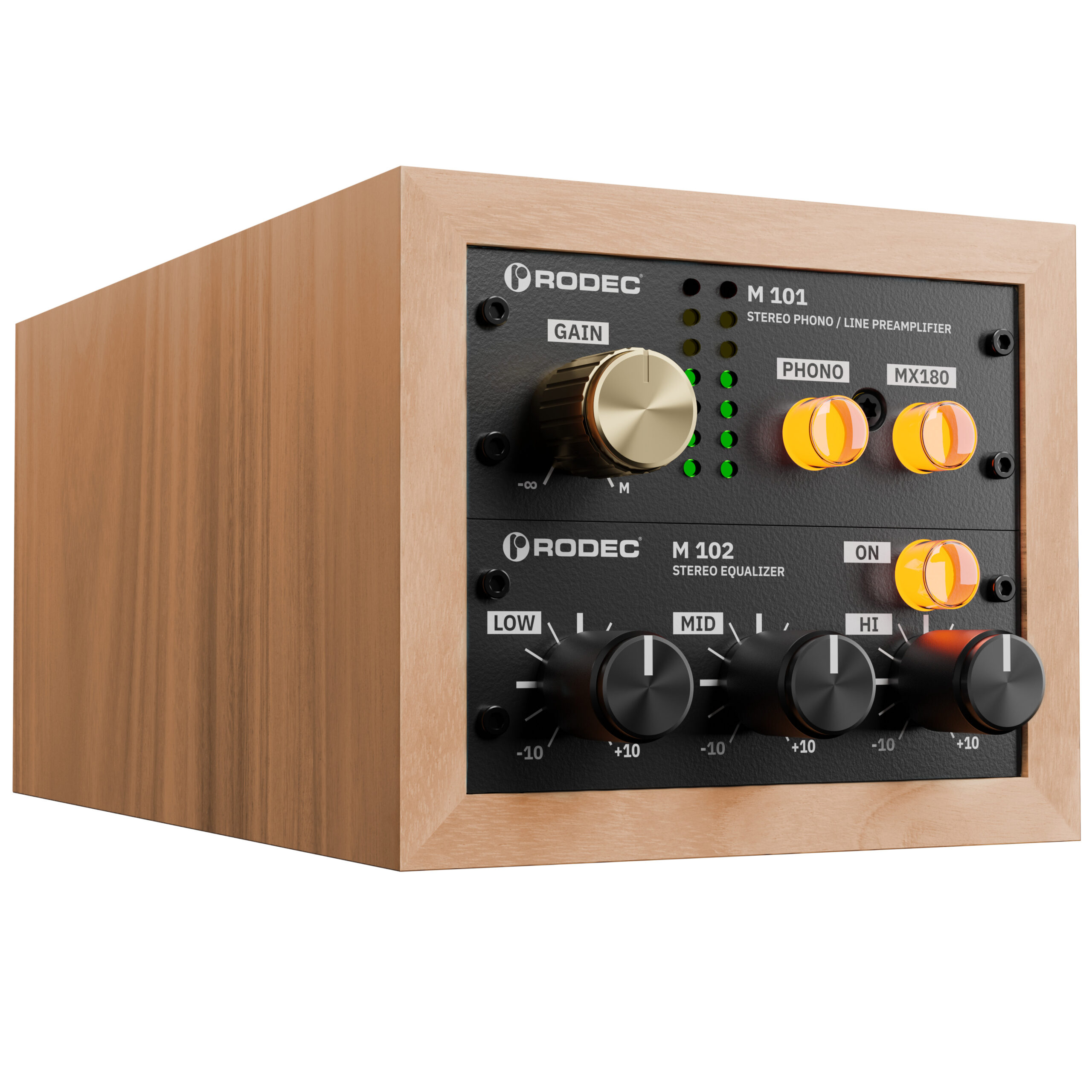 Der MX-180 galt mehr als 30 Jahre als das Flaggschiff unter den Mischpulten von Rodec. Nun sind sein Phono/Line-Vorverstärker und der EQ wieder in einem attraktiven Setup erhältlich. Hifi-Enthusiasten werden nicht nur die grosse Klangbühne mit präziser Ortung und warmer, detailreicher Reproduktion zu schätzen wissen, auch das von Möbeldesignerin Eletta Daemen aus massiven Hölzern hergestellte Gehäuse fügt sich hervorragend ins harmonische Gesamtbild.