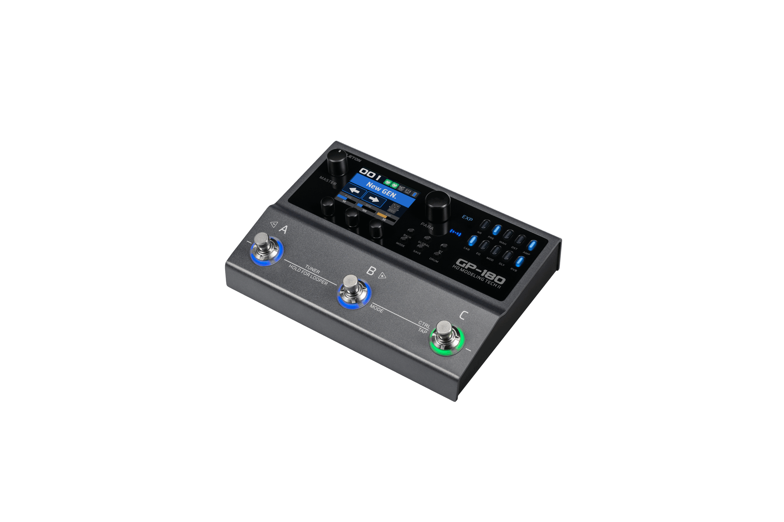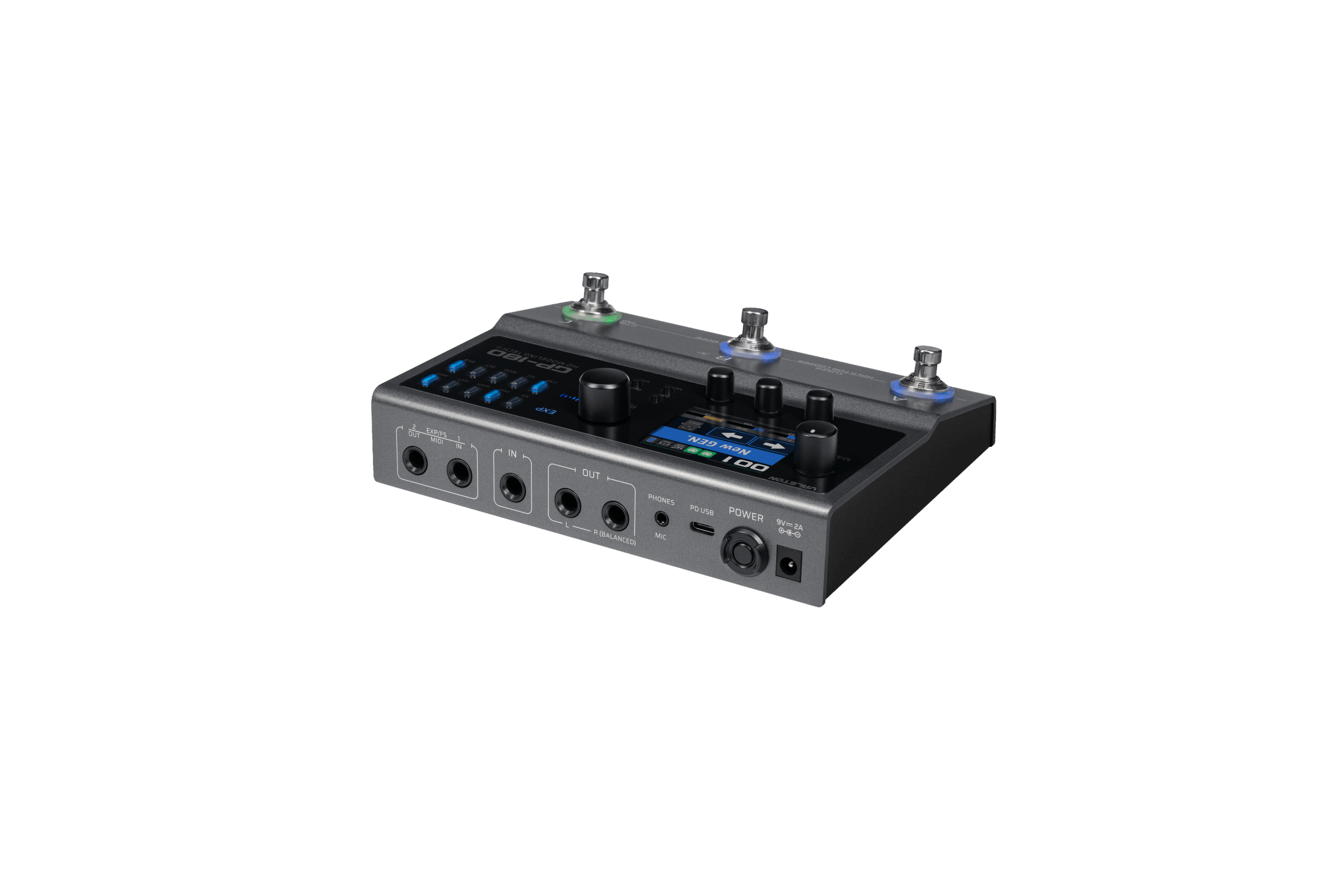 Das GP-180 verfügt über ein neues Layout mit drei Fußschaltern, ergänzt durch mehrere Regler und Tasten, die eine optimierte intuitive Bedienung ermöglichen. Ein hochauflösendes 2,4-Zoll-Farb-LCD-Display zeigt alle Parameter in Echtzeit übersichtlich an. Für erweiterte Steuerungsmöglichkeiten unterstützt das GP-180 Expression-Pedale, externe Fußschalter, MIDI-Befehle und Fußschalter-MIDI-Funktionen – ideal für professionelle Anwendungen.