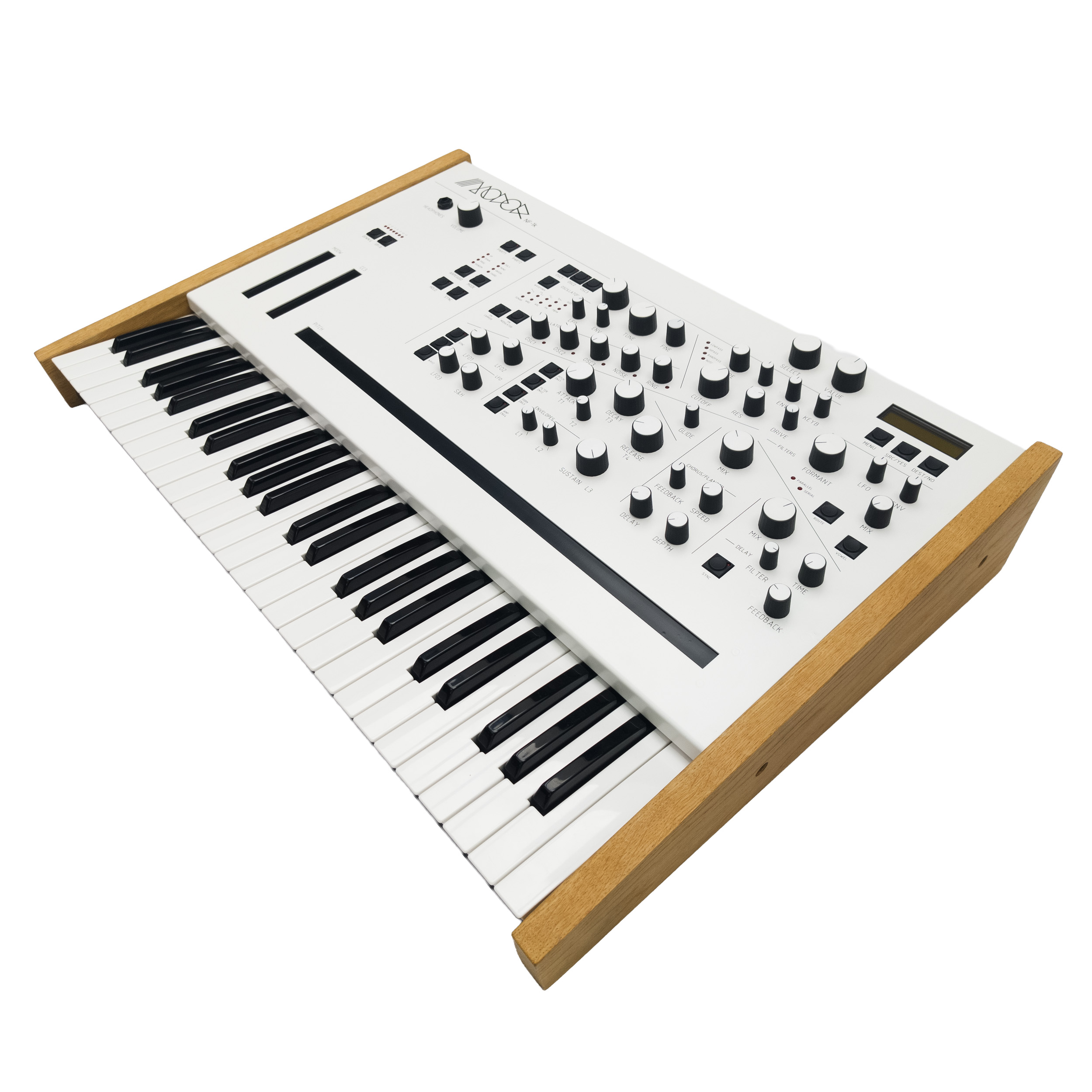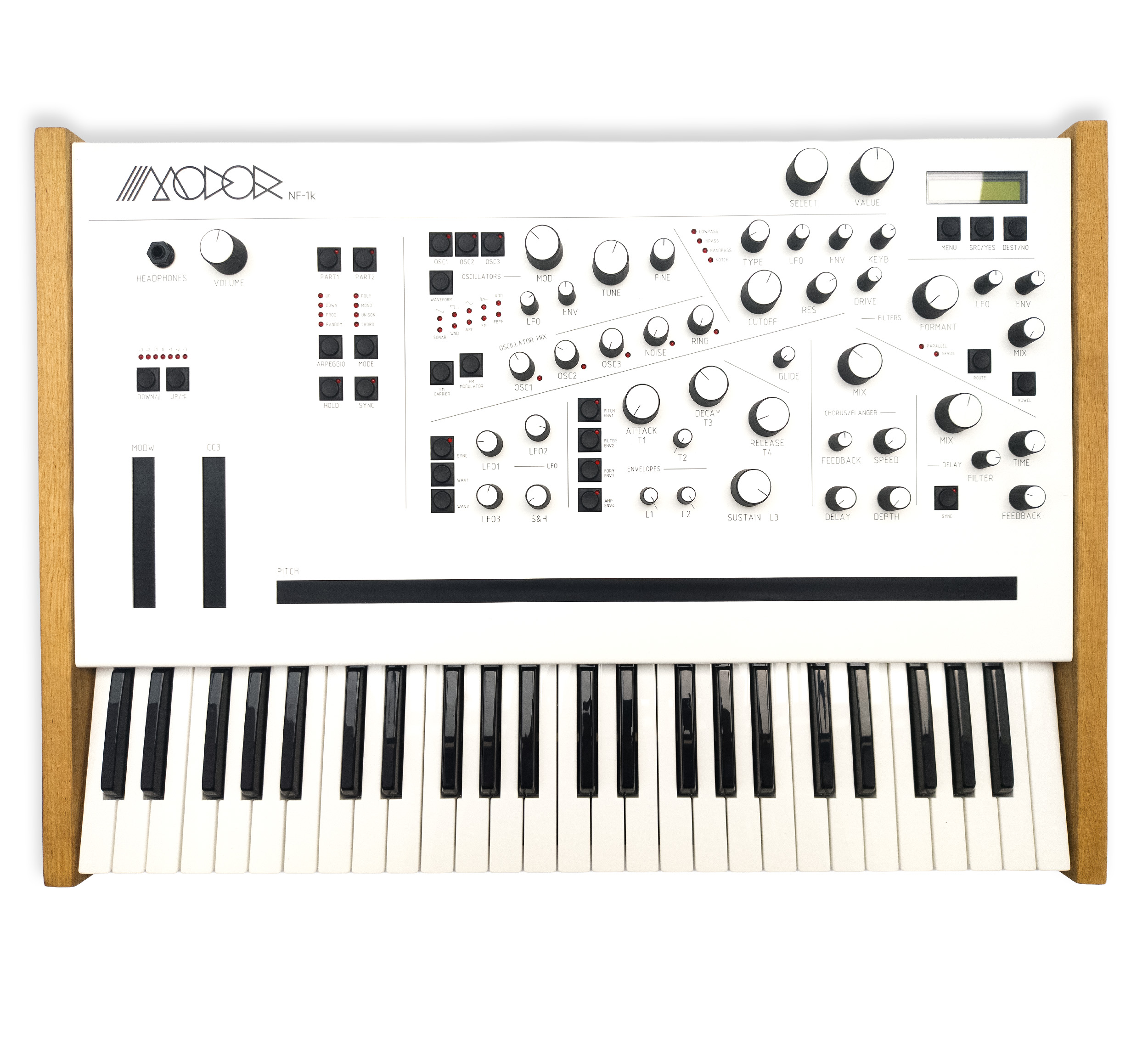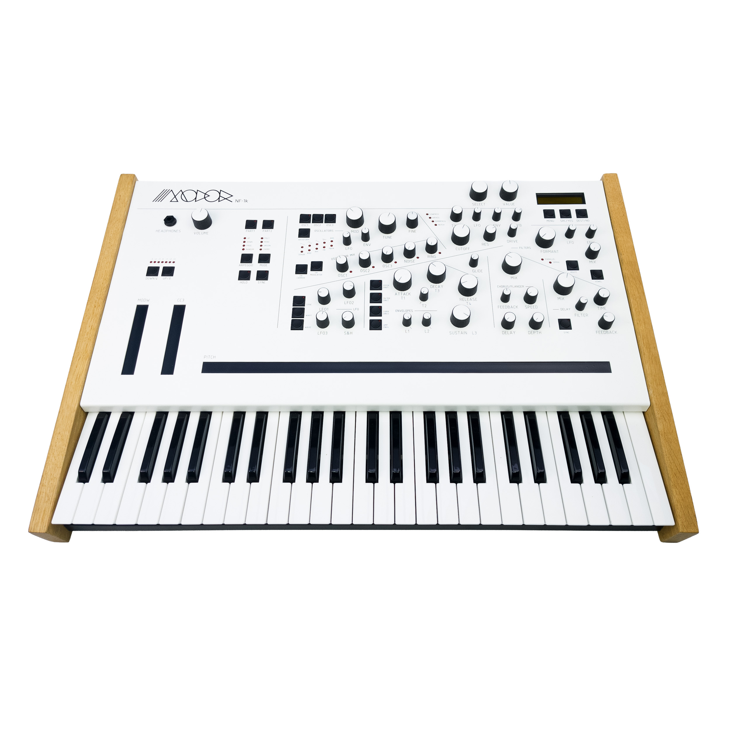 Im Inneren arbeitet die gleiche Sound-Engine wie im NF-1 – jedoch mit verdoppelter Polyphonie auf 16 Stimmen und 2-fach Multitimbralität. Kurz gesagt: wie zwei NF-1 in einem Gerät – ergänzt um eine hochwertige Tastatur.