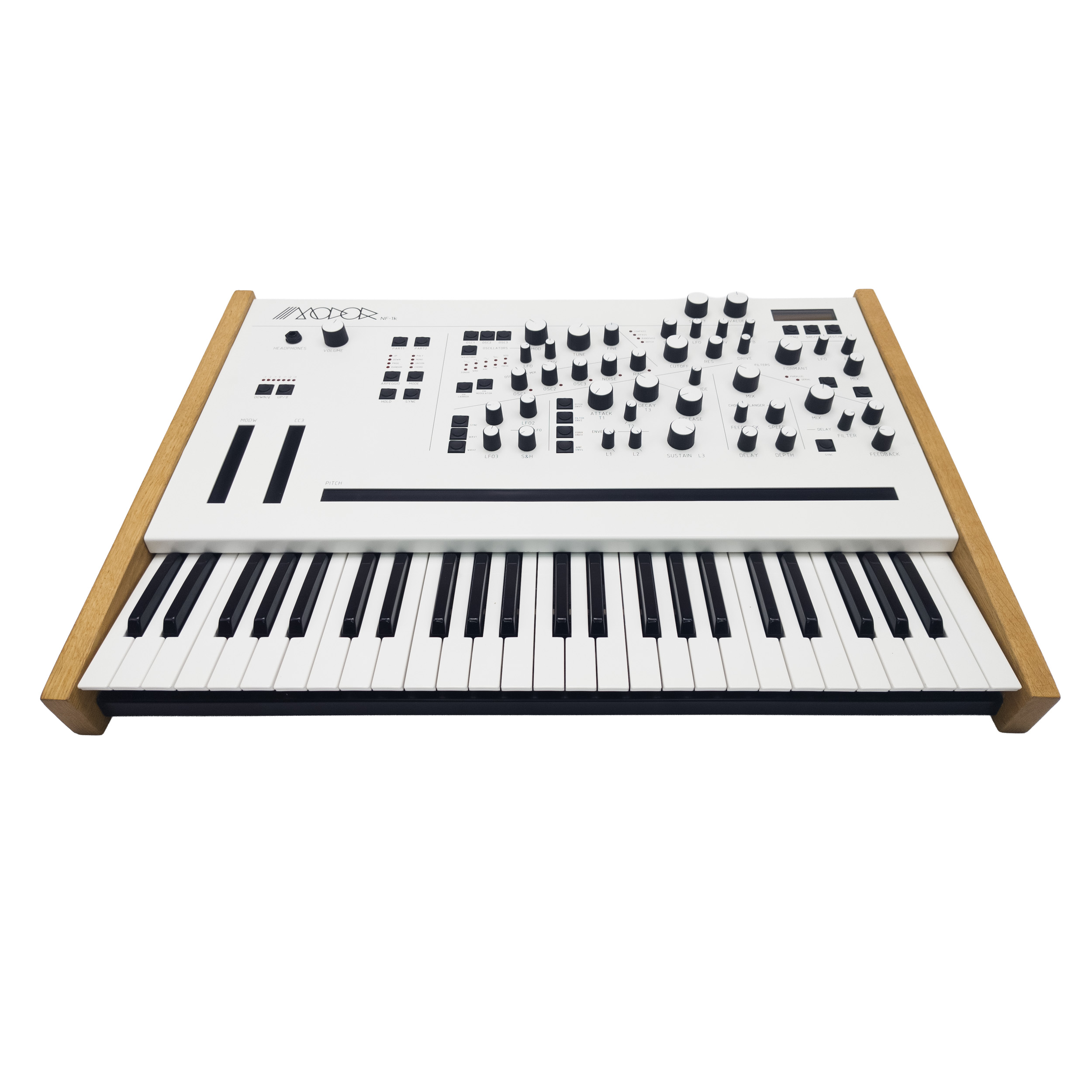 NF-1k ist die konsequent weiterentwickelte Keyboard-Version des NF-1 Desktop-Polysynths. Gefertigt im unverwechselbaren Schwarz-Weiß-Design, überzeugt er mit großen Reglern, einem robusten Metallgehäuse und massiven seitlichen Holzwangen.