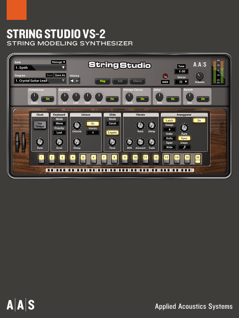 Unter der Haube des AAS String Studio arbeiten die modernsten physikalischen Modelle von Saiten, die unter anderem mit Bogen, Hammer, Finger, Dämpfern und Hölzern beeinflusst werden können. Die traditionellen Oszillatoren, Filter und Hüllkurven wurden durch reale Elemente aus Saiteninstrumenten ersetzt. Durch seine einmalige Struktur kann das AAS String Studio VS-3 den Klang beindruckender Gitarren, Bässe, Harfen, Clavinets, Streicher, Percussion-Instrumente genauso wie besonders warme und animierte Klänge von neuen, bisher ungehörten Instrumenten mit atemberaubender Klangdichte und Natürlichkeit erzeugen. Wie bei allen Softwaresynthesizern von AAS werden sämtliche Klänge in Echtzeit errechnet, und es kommen keine Samples zum Einsatz. String Studio VS-3 ist durch seine durchdachte und übersichtlich strukturierte Oberfläche besonders leicht zu bedienen. Durch den integrierten Browser gestaltet sich das Handling von Parametern und Presets besonders einfach. Neben einer umfangreichen komplett überholten Bibliothek, die viele echte Saiteninstrumente und ethnische Instrumente enthält, wartet String Studio VS-3 auch mit zahlreichen hochwertigen Effekten inkl. Reverb-, Equalizer-, Kompressor- und Gitarrenverstärker-Modellen auf, mit denen Sounds und Instrumente umfangreich bearbeitet und veredelt werden können. In Version 3 kann String Studio zwei unabhängige Klangfarben – entweder gestacked oder gesplittet – zu beeindruckenden Texturen kombinieren. Jeder einzelne Sound verfügt über Effekt- und Morphing-Zuweisungen, die durch zwei Performance-Modulatoren pro Layer für noch mehr Expressivität in Echtzeit gespielt werden können. String Studio VS-3 wird mit vier brandneuen, unverwechselbaren Sound-Packs von Top-Sounddesignern geliefert. Richard Devine, Christian Laffitte, Thiago Pinheiro und Daniel Stawczyk haben bei ihren 227 neuen Sounds die Möglichkeiten von String Studio VS-3 optimal ausgenutzt.